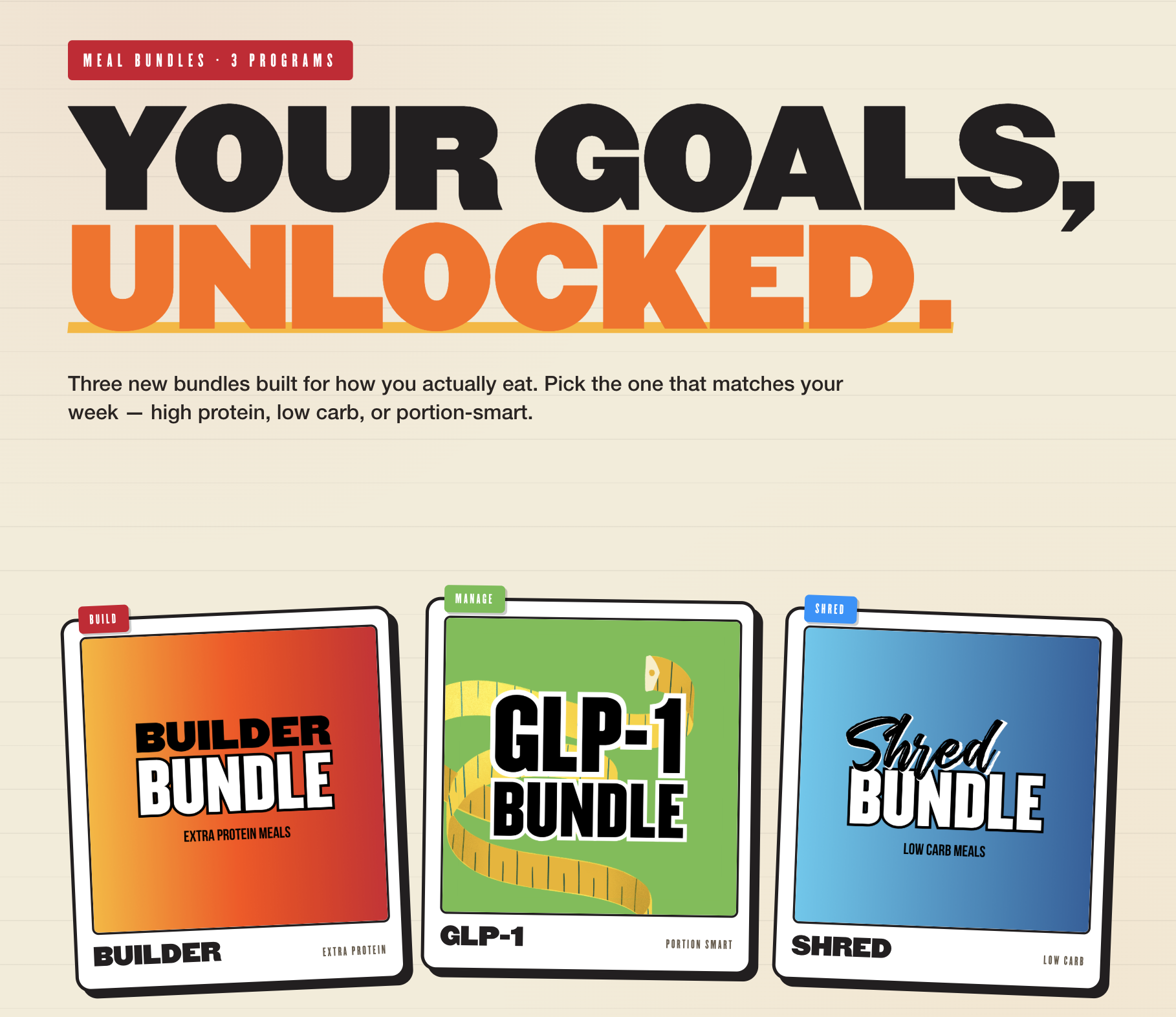 Three goal-specific meal bundles — Shred, Builder, and GLP-1 — built fresh from every week's menu. 5 meals, one goal, zero guesswork.